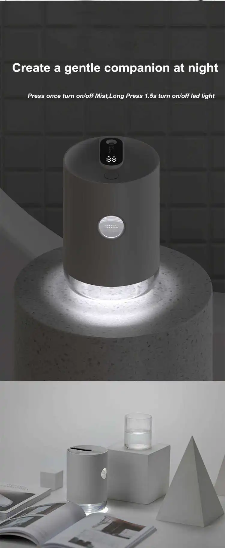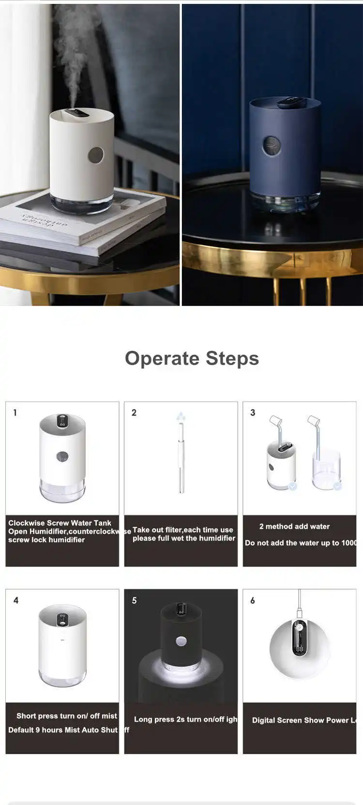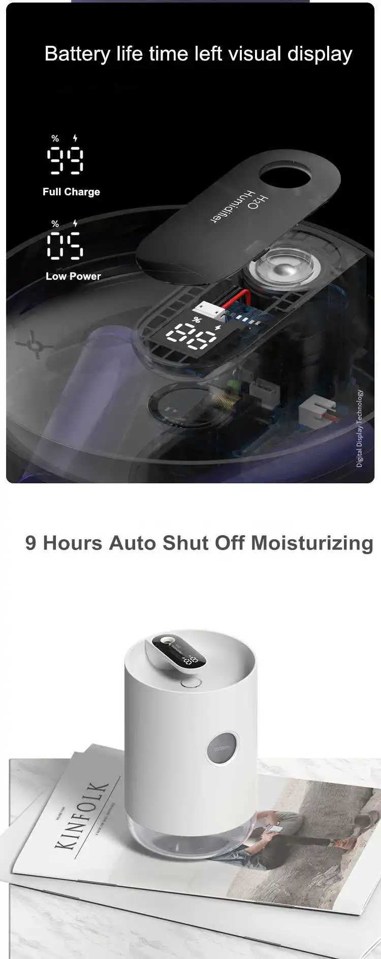 2. Humidifier battery can work 8 hours, water tank can work up to 14 hours