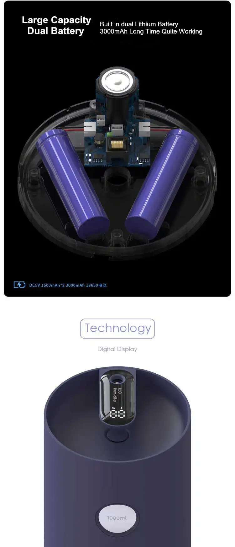 Home Air Humidifier 1L 3000mAh Portable Wireless USB Aroma Water Mist Diffuser Battery Life Show Aromatherapy Humidificador