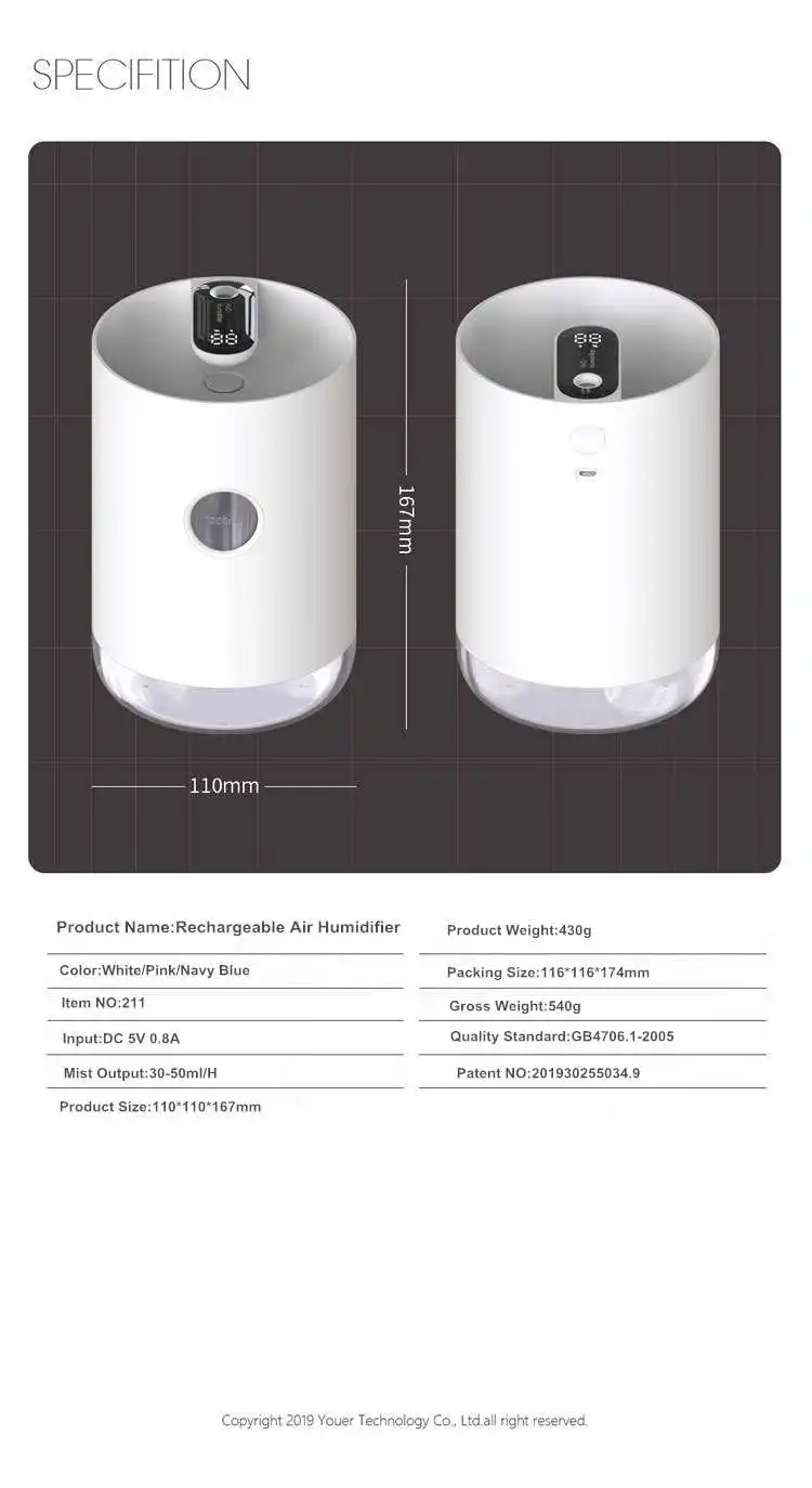 Product Name :1000ML Wireless 3000mAh Home Air Humidifier