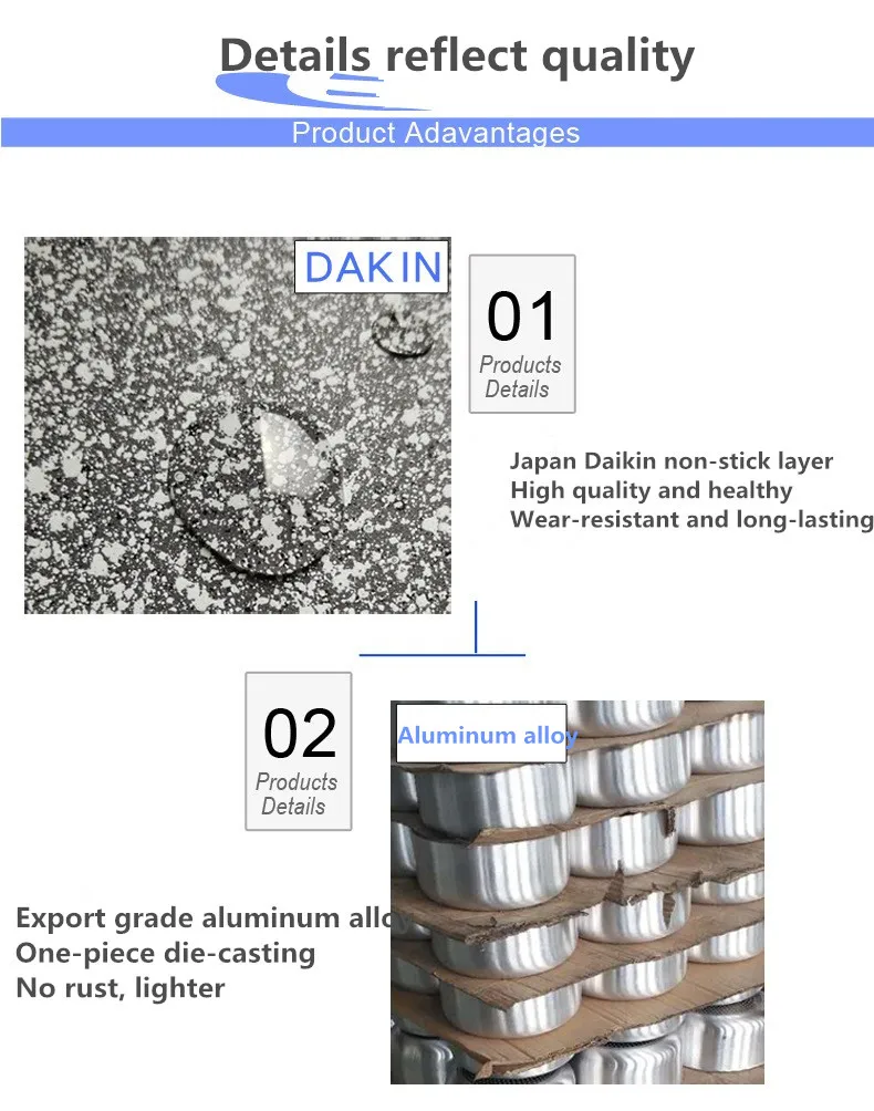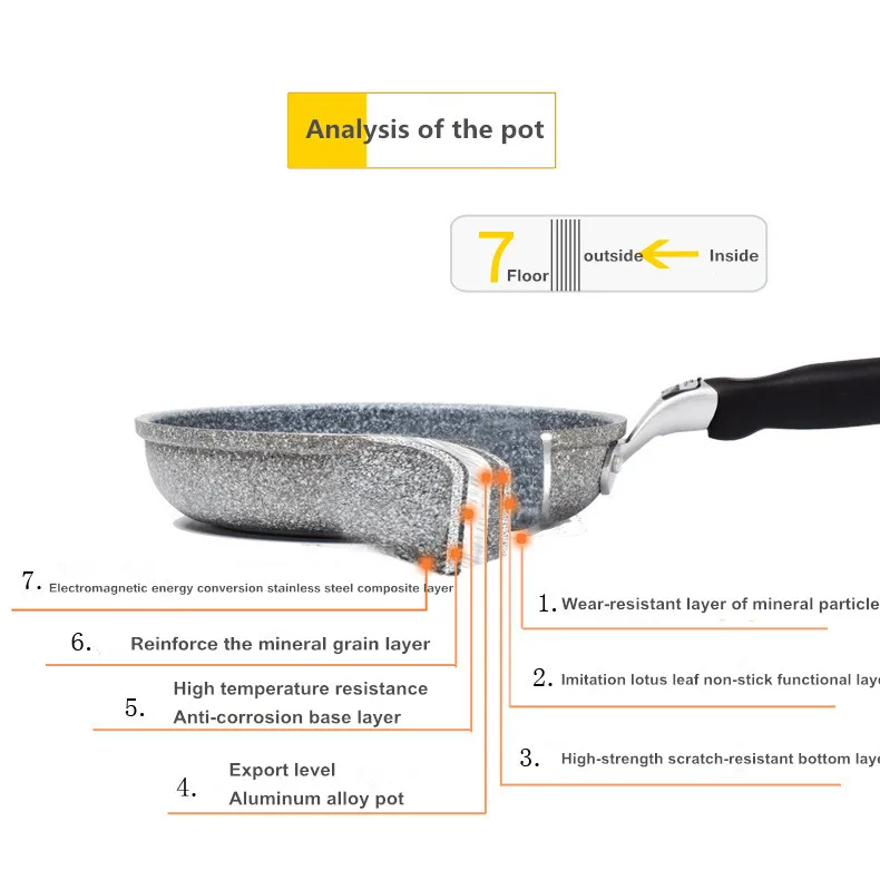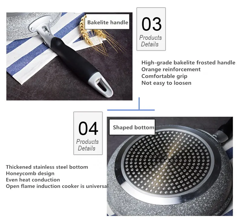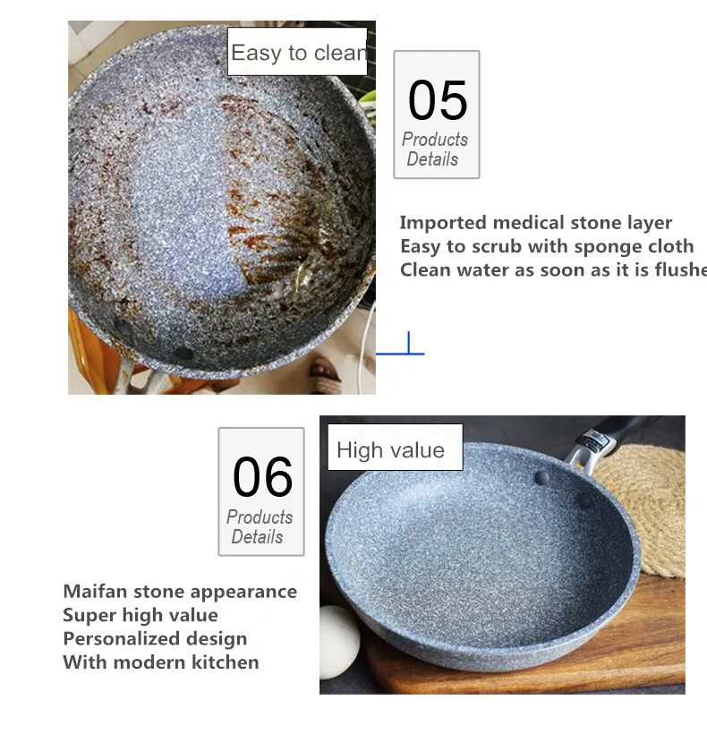 Use: The non-stick pan heats up quickly. Under normal circumstances, it can meet the cooking requirements by using a medium and small fire. When using a high fire, there must be food or water in the pot. Do not let the pots and pans boil empty. So as to prevent the pot body from turning yellow and black. If you accidentally burn it in the air for a long time, turn off the heat immediately and let it cool down naturally, which will not affect subsequent use.